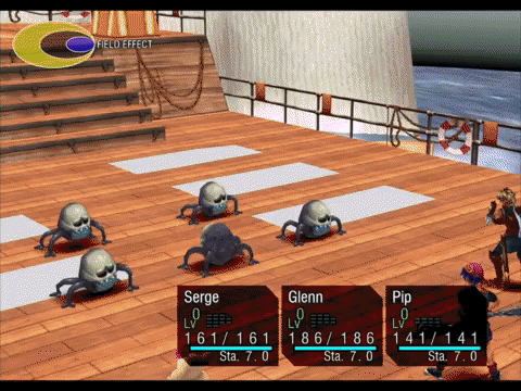 Constructed of several Dead Beat, this creature assaults Serge and his while attempting to steer the S.S. Invincible away from the Ghost Ship, so Fargo and his pirates can battle the other undead infantry on the ship's deck. Among its move-sets are Diminish, Death'sOdor, and Dark Breath. Immediately after engaging in battle, several Dead Beat jump atop each other and morph into the DeadHead, and the newly created monster casts Diminish, weaking White Elements. Periodically, DeadHead will cast Death'sOdor, which has a low hit rate but can cause negative Status Effects. Usually, it will only cast this technique once per battle, unless the Status Effect is cured using consumable elements. Dark Breath targets one party member and does a small amount of damage. Additionally, DeadHead's physical attacks are also relatively weak, but it will attack several times in succession. To easily defeat the creature, use characters that deal high physical damage, such as Serge, Kid, or Glenn. Sprinkle these attacks with White Techs, such as Dash&Slash, whenever possible. White elements will be weakened by diminish but still do decent amounts of damage for physically weak characters such as Luccia. Keep the party healed when their Hit Points run low, and the battle should run smoothly.