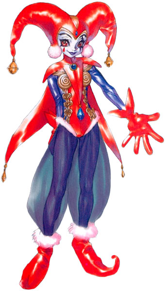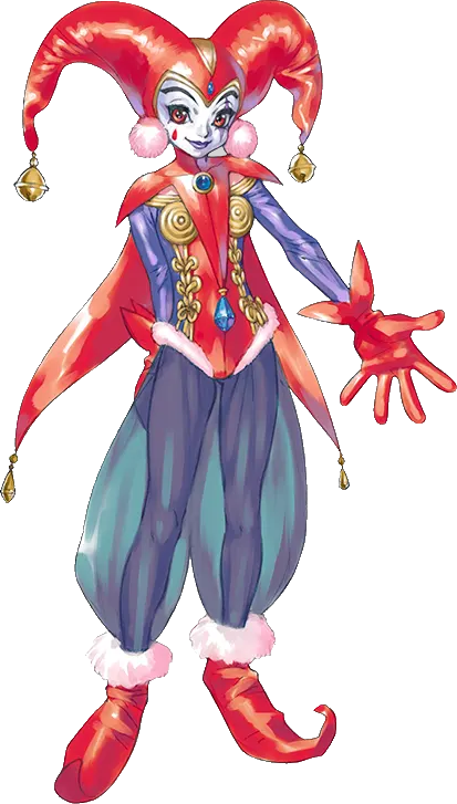 Created in the year 1006 A.D., Harle is the enigmatic seventh Dragon from the 81st Dimension. Controlled by the will of the Time Devourer and housed in Chronopolis, the Dragon God is tended to by the citizens of the city. Her birth occurs during the magnetic storm that temporarily flatlines the power sources of Chronopolis, which allows the Dragon God to create a life form that could go undetected and act as an agent in El Nido. When created, she bears the resemblance of an eighteen-year-old girl, dressed in colorful garments resembling those typically worn by clowns. From her inception, Harle is ordered to retrieve the Frozen Flame and return it to the Dragon God; to this end, she befriends Lynx, feigning obedience to his cause when her loyalties lie elsewhere. In the year 1015 A.D., she accompanies him to Lucca's house, where they start a fire and abduct Lucca in hopes of disengaging the Prometheus Circuit, which protects the Frozen Flame. When this effort fails, Harle and Lynx decide to wait for Serge to cross dimensions and retrieve the Flame for them.