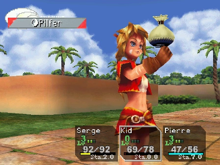 If the tech is successful, Kid bounces a cloth coin purse in her hand, smiling, and a message pops up revealing what loot was appropriated. If she fails, she scurries back to her battle position, kicks at the ground, and a message tells that the attempt at thievery failed. Most enemies carry two steal-able items. One that is commonly acquired and one that is rarely acquired. The rarer steal is generally a better item.